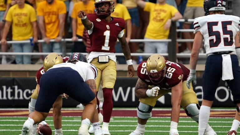 O quarterback Thomas Castellanos levou o BC a uma vitória de 56 a 0 sobre o Duquesne na semana passada, mas as coisas ficam decididamente mais difíceis neste sábado contra o Missouri. Barry Chin/Equipe Globe