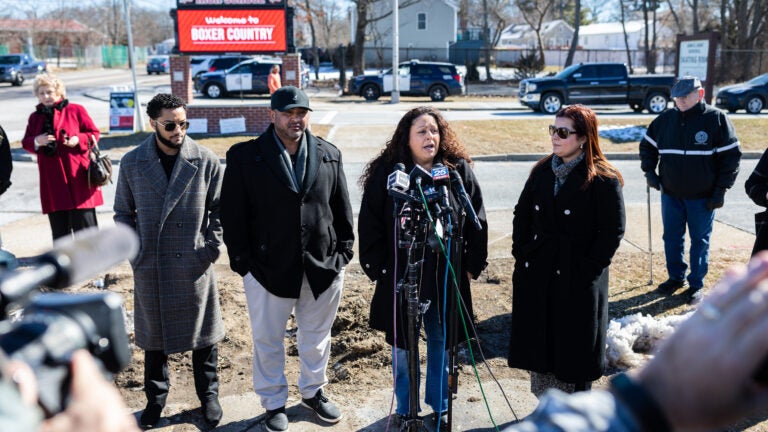 Uma coletiva de imprensa na Brockton High School em fevereiro. (Nathan Klima para o The Boston Globe)