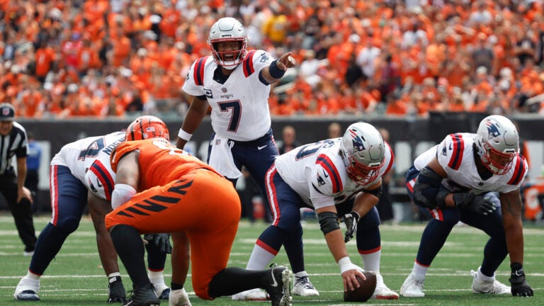 O quarterback dos Patriots, Jacoby Brissett, faz uma ligação durante a abertura da temporada contra os Bengals. Danielle Parhizkaran / Equipe Globe