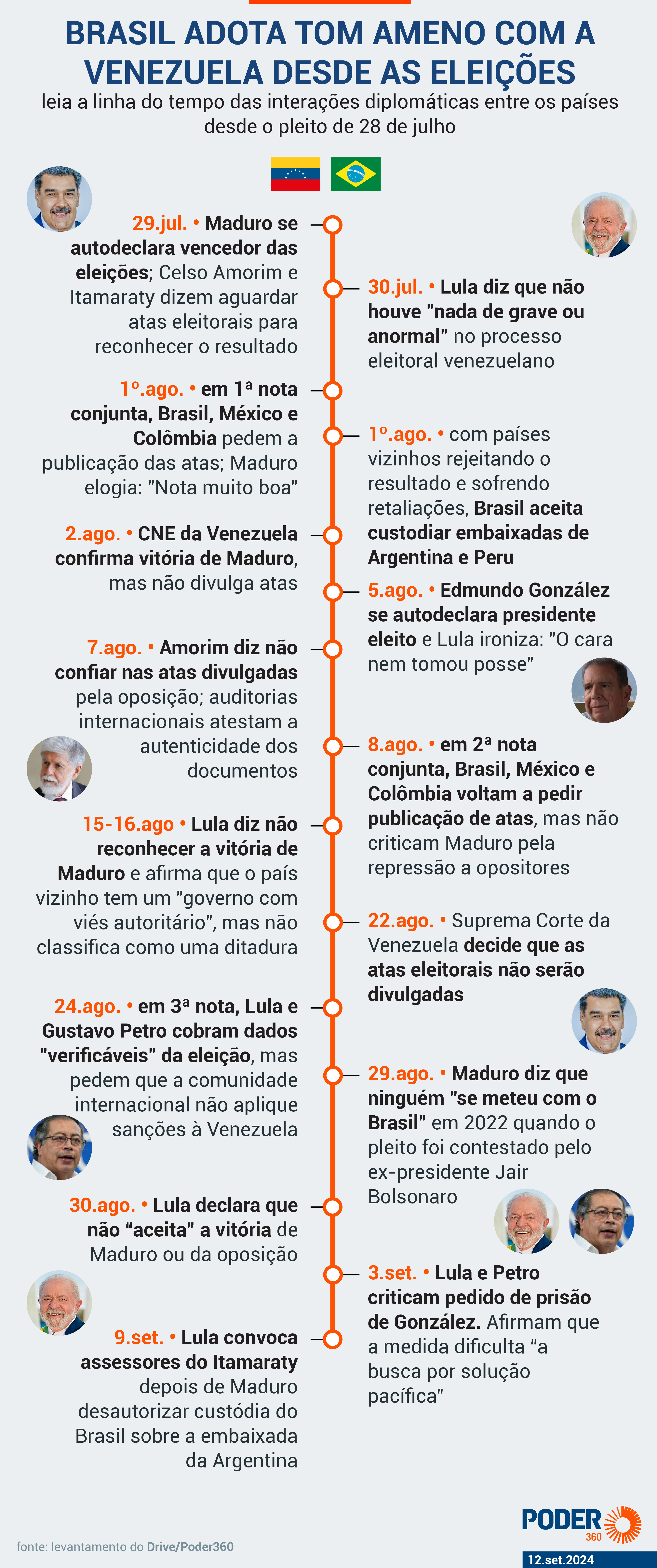 Segundo apurou o Poder360, o governo ficou irritado com a decisão sobre a representação diplomática argentina. Mas mantém o posicionamento de não cortar relações com a Venezuela e continuar com as tentativas de negociação, embora Lula tenha falhado em se qualificar como interlocutor para promover a volta da democracia na Venezuela depois das eleições de 28 de julho.