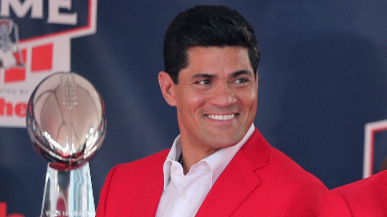 Tedy Bruschi durante sua cerimônia de posse no Hall da Fama dos Patriots em 2019. Jim Davis/Equipe Globe