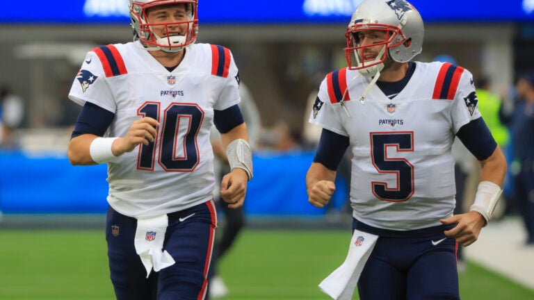 Os quarterbacks do New England Patriots, Mac Jones e Brian Hoyer, correndo para o campo antes de jogarem contra o Los Angeles Chargers durante a ação da NFL no SoFi Stadium. (Matthew J Lee/equipe Globe)