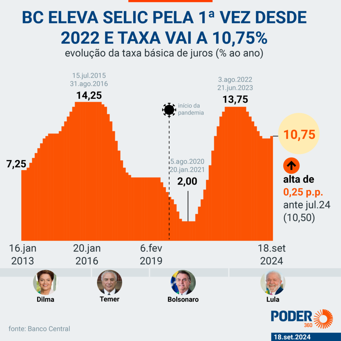 O Banco Central decidiu nesta 4ª feira (18.set.2024) elevar a Selic para 10,75% ao ano. O aumento foi de 0,25 ponto percentual. É a 1ª vez que a autoridade monetária sobe a taxa básica de juros desde agosto de 2022 –há 2 anos e 1 mês. A decisão dos diretores do órgão foi unânime.