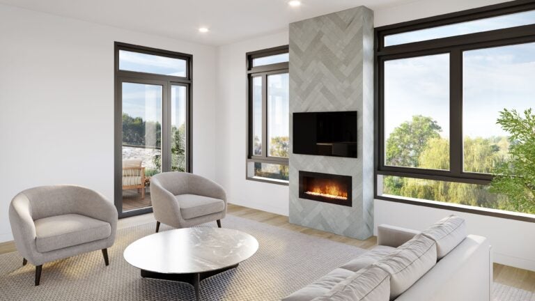 A sala de estar contará com uma lareira elétrica e janelas amplas. Renderizações de Jim Nemetz/Hammond Residential