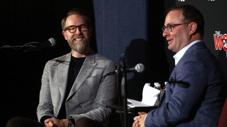 Adrian Wojnarowski, à direita, com o gerente geral do Oklahoma City Thunder, Sam Presti, em um evento no Emerson College em 2019. Barry Chin / Equipe Globe