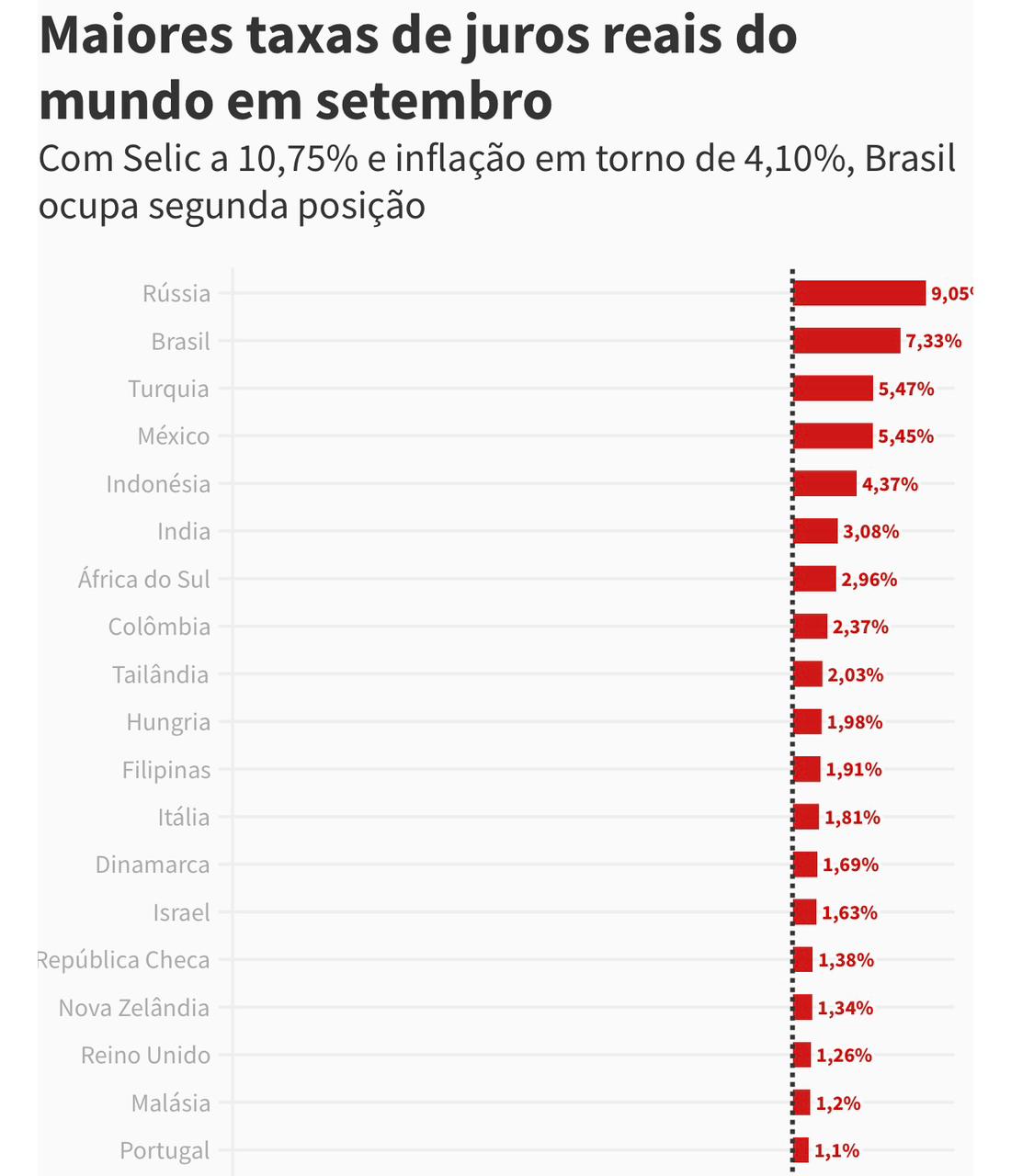 Com a revisão para cima da Selic, em 10,75% ao ano, o Brasil se consolida na segunda posição do ranking de países com as maiores taxas de juros reiais do mundo, segundo relatório da MoneYou.