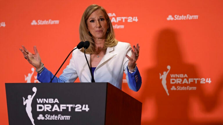 A comissária da WNBA, Cathy Engelbert, fala com a mídia antes do draft. AP Photo / Adam Hunger, Arquivo