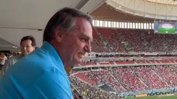 O ex-presidente Jair Bolsonaro (PL) foi ovacionado em pleno estádio Mané Garrincha, em Brasília, neste domingo (22), durante o duelo entre Vasco e Palmeiras pelo Campeonato Brasileiro.