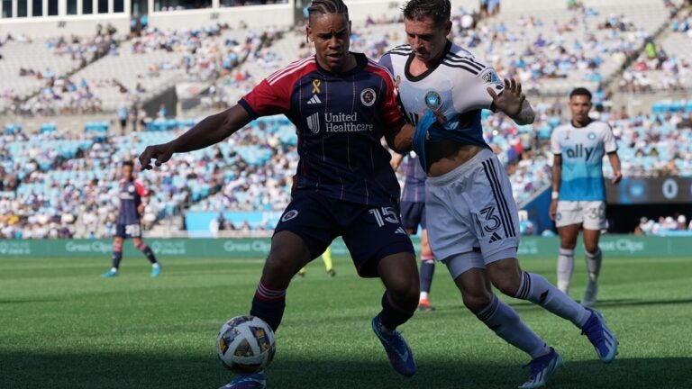 Brandon Bye, do Revolution, luta com Brandt Bronico, de Charlotte, durante a partida de sábado em Charlotte, Carolina do Norte Revolução da Nova Inglaterra