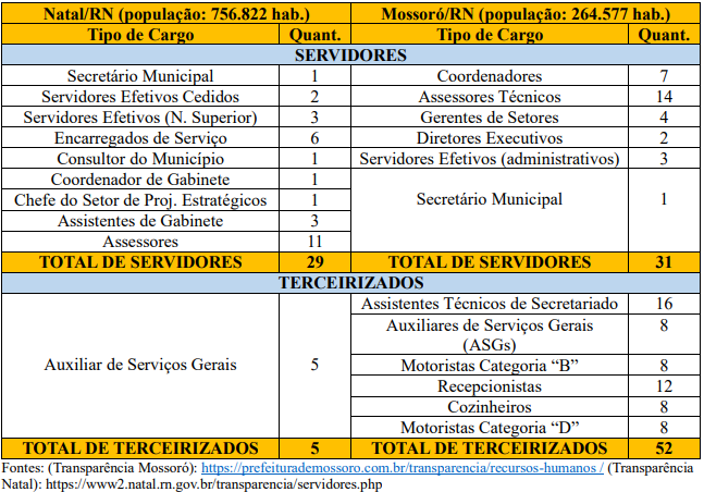 Além disso, com uma cidade bem maior para administrar, Álvaro conta com 29 servidores comissionados e cinco terceirizados. Já Allyson conta com 31 servidores comissionados e incríveis 52 terceirizados.