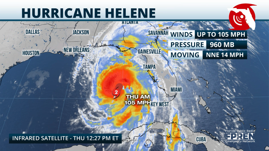 Em um aviso às 11ho Centro Nacional de Furacões indicou que Helene tem ventos máximos sustentados de 105 mph.