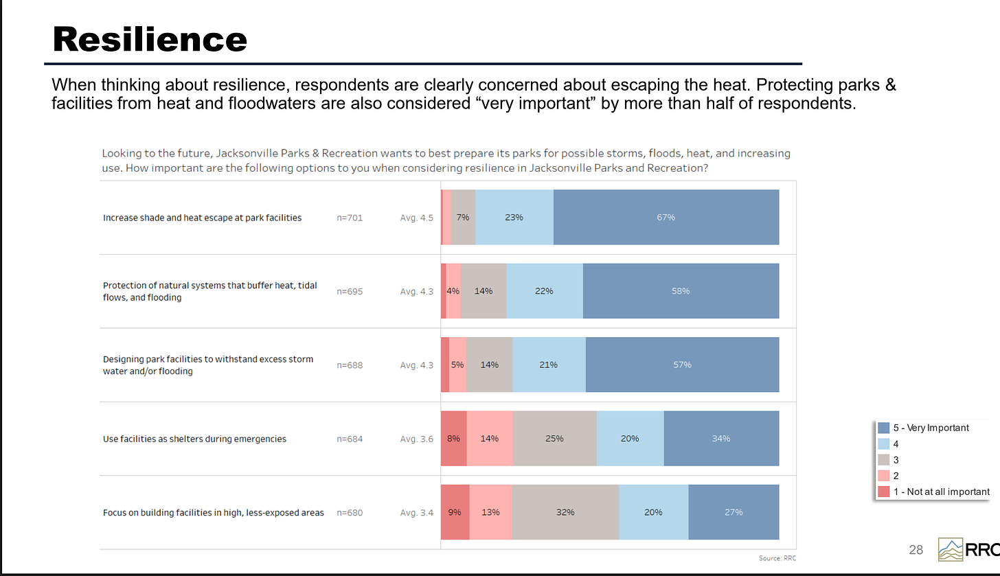 Quando questionados especificamente sobre resiliência, a esmagadora maioria dos entrevistados escolheram a necessidade de maior sombra e a proteção de “sistemas naturais que amortecem o calor, os fluxos das marés e as inundações” como prioridades futuras do parque. Claramente, os entrevistados compreendem o papel que os parques devem desempenhar no alívio das realidades mortais das alterações climáticas presentes e futuras – o calor excessivo do verão e a expansão das águas das inundações.