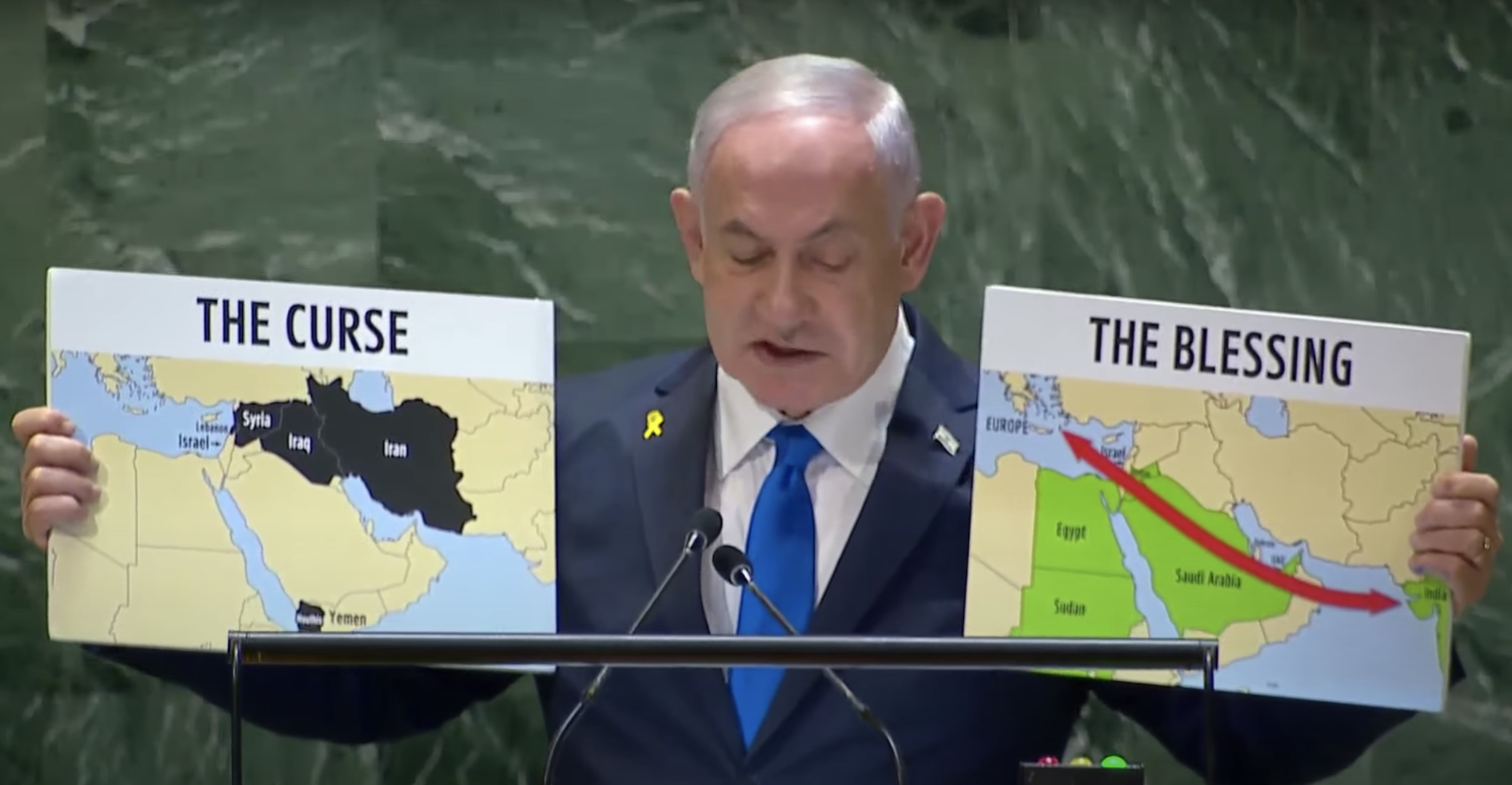 Na imagem, Benjamin Netanyahu segura um mapa (à esquerda) que mostra os aliados do Irã e outro (à direita) com os aliados de Israel; “É um mapa de uma maldição. É um mapa de um arco de terror que o Irã criou e impôs desde o Oceano Índico até o Mediterrâneo”, disse o premiê de Israel, referindo-se ao mapa do Irã, durante seu discurso na ONU