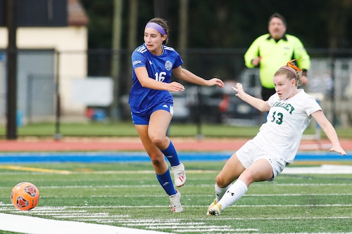 Tara Stewart (13) de Pascack Valley e Chloe Abramson (16) de Demarest lutam pela bola durante o jogo de futebol feminino entre Demarest e Pascack Valley na Demarest High School em Demarest, NJ, na quinta-feira, 30 de setembro de 2021.Scott Faytok | Para NJ Advance Media