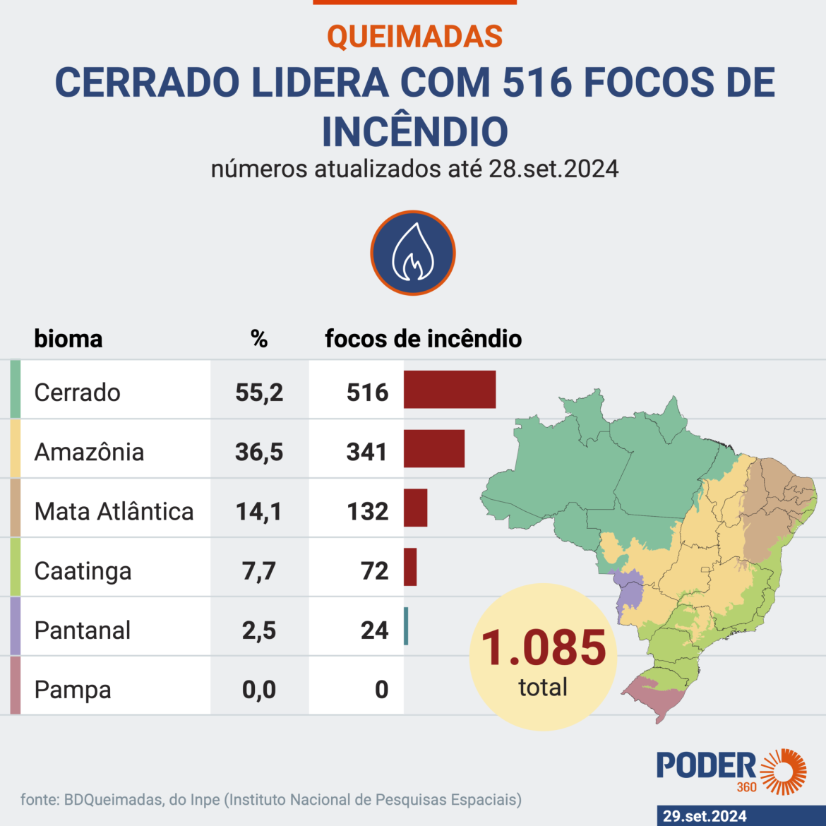 O Brasil registrou 1.085 focos de incêndio no sábado (28.set.2024), segundo dados do BDQueimadas, do Inpe (Instituto Nacional de Pesquisas Espaciais). O país havia registrado uma queda no número de alertas, que foram de 1.374 para 934 focos de 5ª feira (26.set) para 6ª feira (27.set).