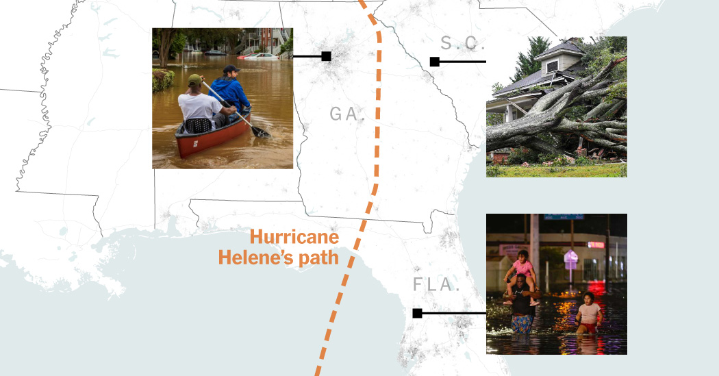 O furacão Helene, uma poderosa tempestade de categoria 4 quando atingiu o continente, abriu um caminho devastador da costa do Golfo da Flórida até o Tennessee. Relatos de destruição e inundações de nível recorde se estenderam por mais de 600 milhas. Até sábado, as autoridades relataram pelo menos 60 mortes causadas pela tempestade.