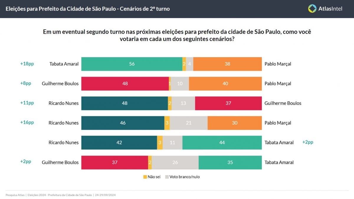 O levantamento também mediu a preferência dos eleitores em seis cenários distintos de segundo turno. No confronto principal, entre Boulos e Marçal, o deputado do PSOL levaria a melhor sobre o ex-coach. Veja os números: