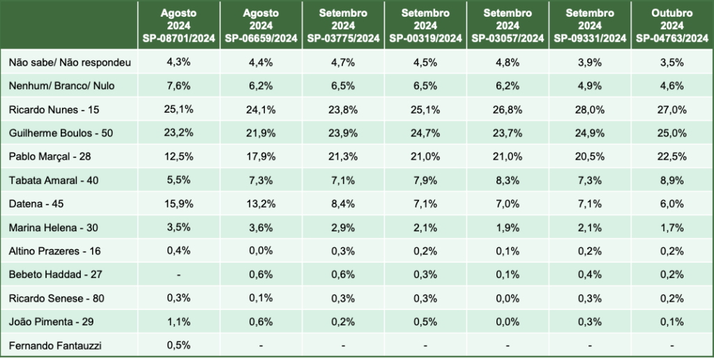 Em praticamente todas as pesquisas, os cenários são de empate técnico entre os três principais concorrentes à Prefeitura de São Paulo. Apenas o instituto Veritá mostra Marçal consolidado em primeiro lugar.