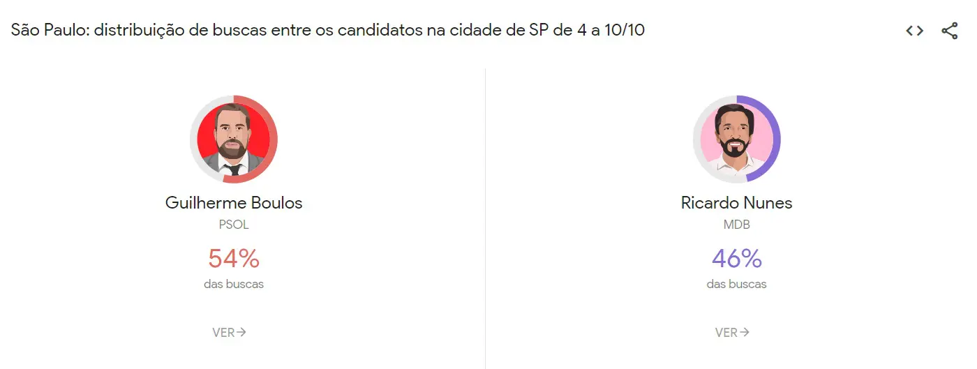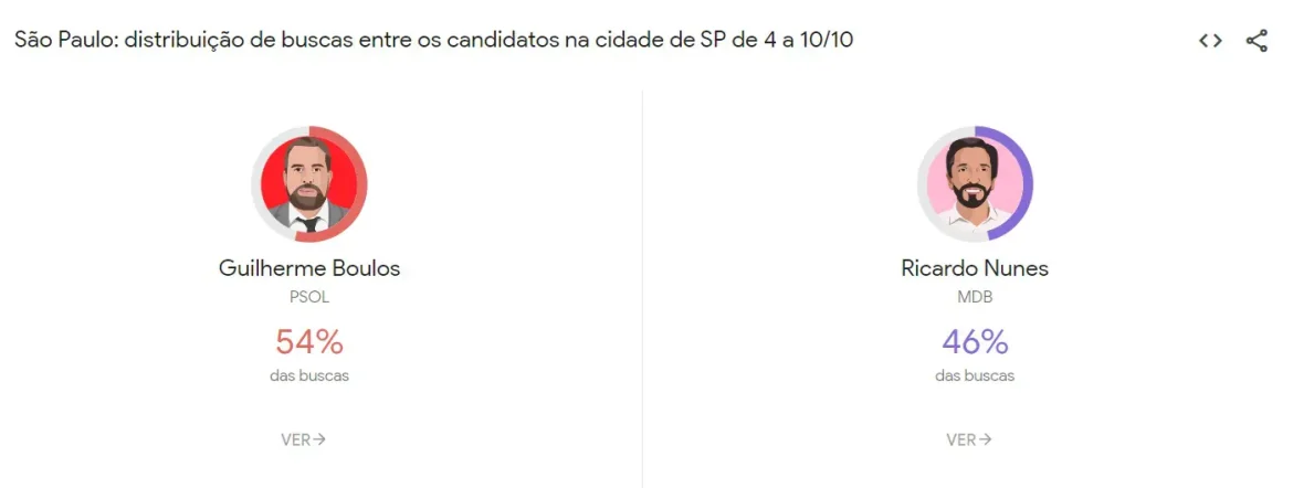 A ferramenta Google Trends informou que o candidato mais pesquisado da eleição para o comando da cidade de São Paulo é o deputado federal Guilherme Boulos (Psol). O psolista registrou 54% da curiosidade dos internautas, contra 46% do prefeito Ricardo Nunes.