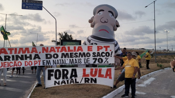 Manifestantes contrários ao presidente Luiz Inácio Lula da Silva (PT) ergueram o “Pixuleco”, nome dado ao boneco inflável gigante com roupas de presidiário feito a semelhança de Lula, próximo a Ponte Newton Navarro, em Natal.