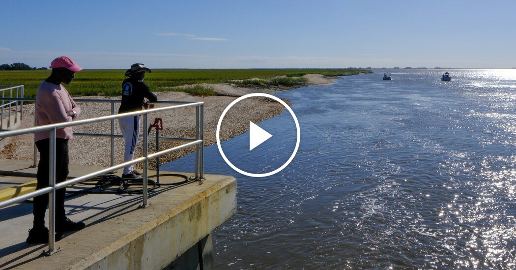 Transeuntes e equipes de resgate procuraram vítimas depois que a passarela de um cais de balsa na ilha de Sapelo desabou na água.