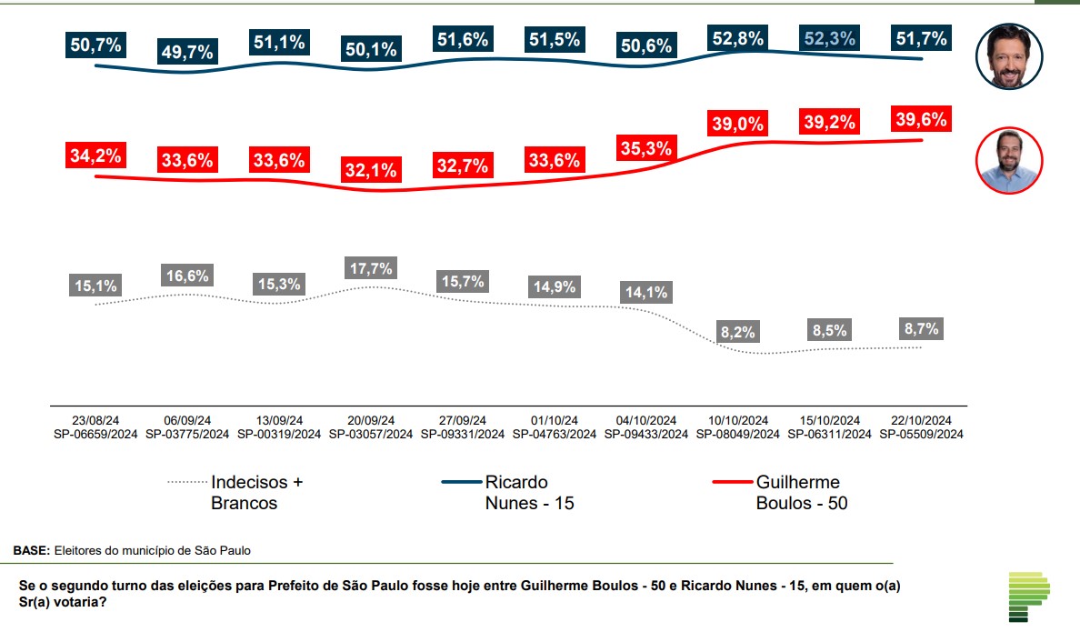 Os porcentuais da pesquisa estimulada mostram a estabilidade dos dois candidatos desde o fim do primeiro turno. Nos dois levantamentos anteriores, Nunes, por exemplo, registrou 52,8% e 52,3%. Boulos, por sua vez, se manteve abaixo dos 40% nas duas ocasiões: 39% e 39,2%.