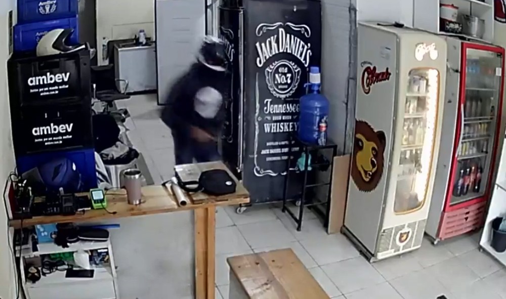 Nas imagens, é possível ver quando os dois entregadores entram na câmara fria para se esconder de dois criminosos armados, enquanto o atendente se protege atrás do balcão. Em seguida, um homem de capacete faz mais de 20 disparos contra a vítima e foge.