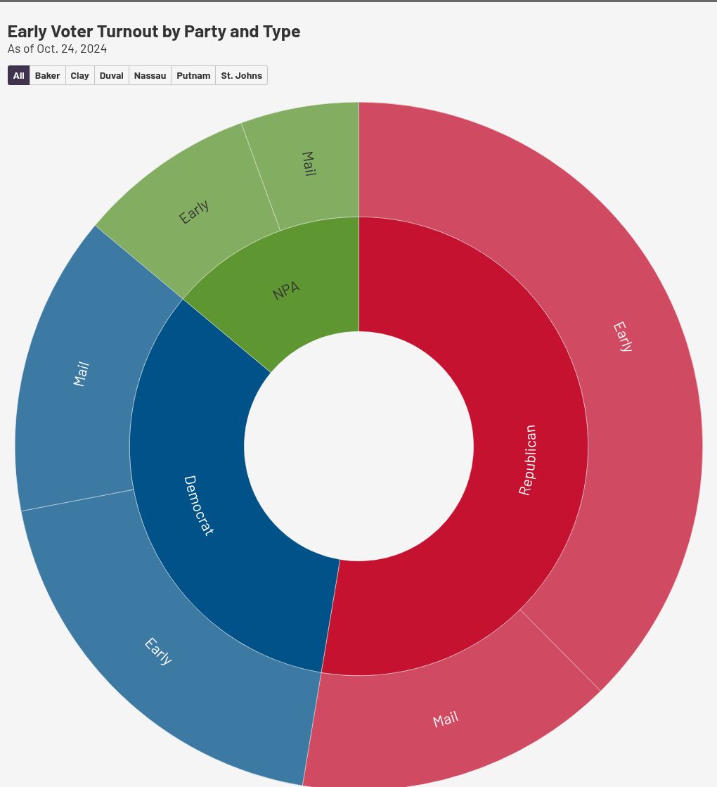 A participação até agora é maior no condado de St. Johns, onde 25,81% dos eleitores já votaram. No condado de Baker, apenas 11,84% dos eleitores votaram. (No entanto, mais de metade dos eleitores do condado de Baker compareceram às primárias de agosto – uma percentagem praticamente inédita nas eleições primárias.)