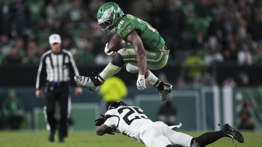 Os Jaguars interromperam duas vezes a famosa jogada de “tush push” de Philly, também conhecida como “empurrão fraternal”, em uma conversão de dois pontos. Os Eagles raramente são interrompidos em jogadas de jardas curtas.