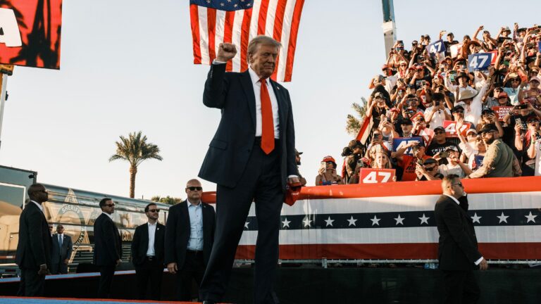 O ex-presidente Donald Trump sobe ao palco para um comício de campanha em Coachella, Califórnia, no sábado, 12 de outubro de 2024. Jordan Gale/The New York Times
