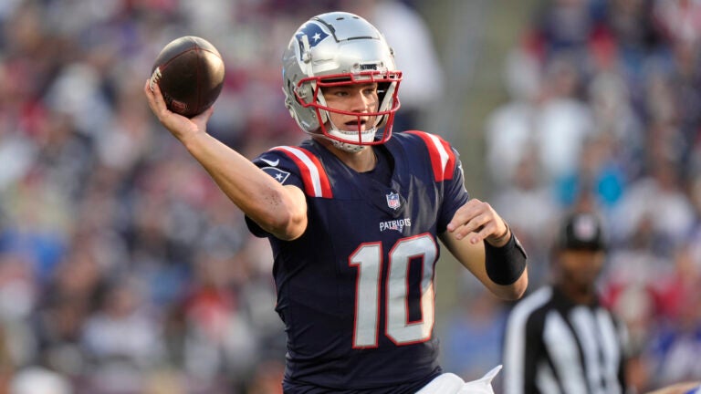 Drake Maye durante o jogo Patriots-Rams. AP Foto/Steven Senne