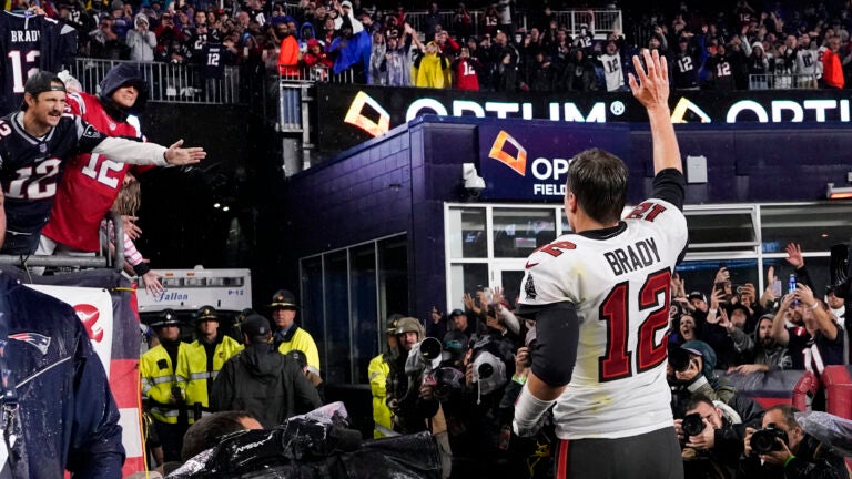 O quarterback do Tampa Bay Buccaneers, Tom Brady, acena para os fãs ao deixar o campo no Gillette Stadium após derrotar o New England Patriots por 19 a 17, domingo, 3 de outubro de 2021, em Foxborough. Elise Amêndola/AP