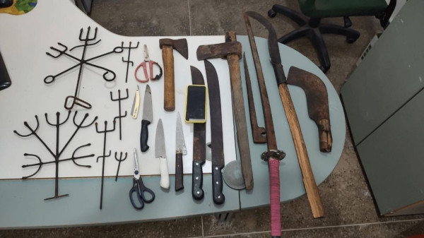 O homem que teve o mandado de prisão preventiva e de busca aceito pelo Poder Judiciário, foi encontrado pelos agentes no bairro Olho D’Água. No local, as equipes apreenderam diversos instrumentos de ferro, machados, tesouras e outros objetos, além de um aparelho celular.