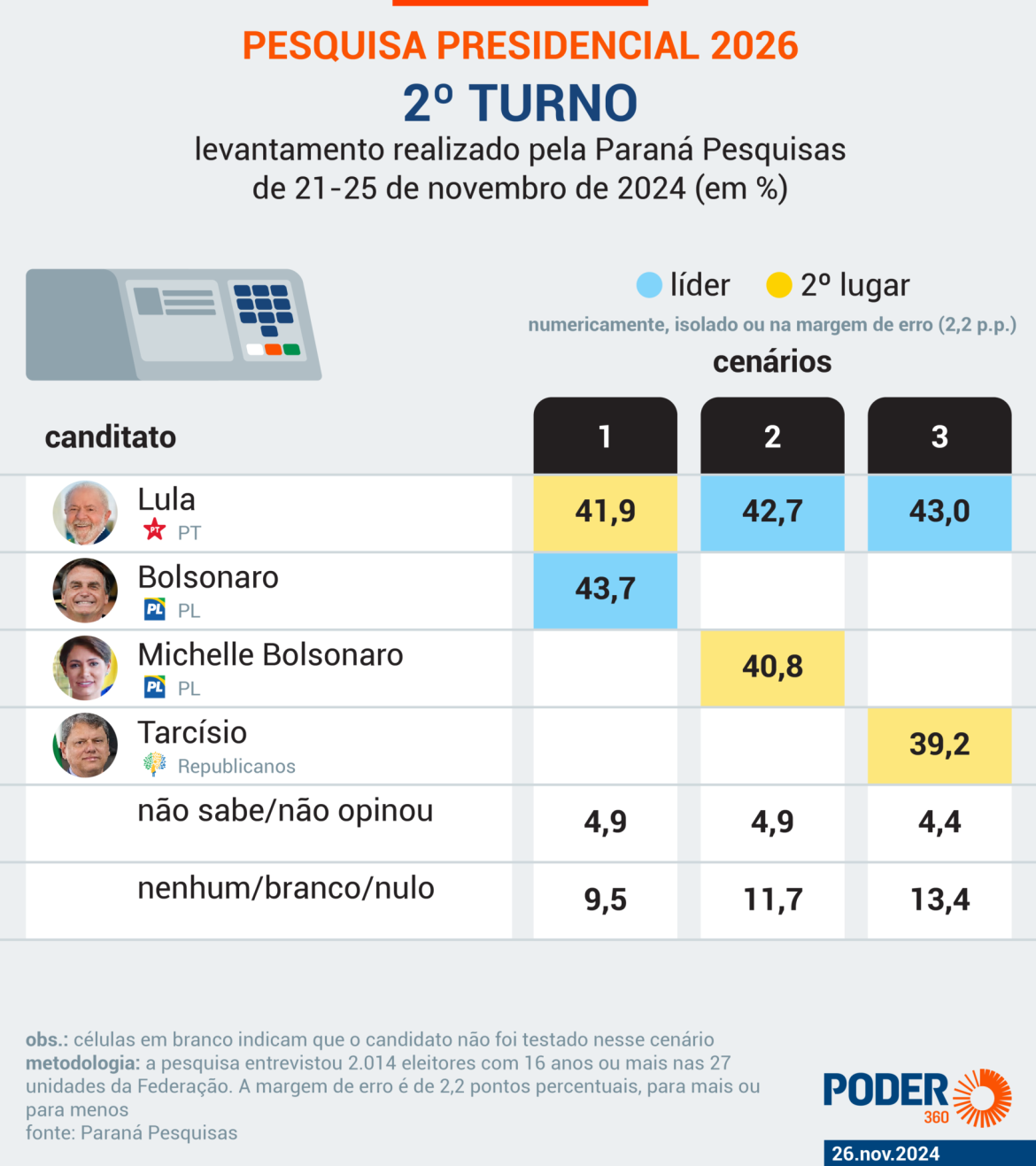 Se a eleição presidencial fosse hoje, Jair Bolsonaro (PL), que neste momento está inelegível, teria 37,6% dos votos contra 33,6% do atual ocupante do Palácio do Planalto, Luiz Inácio Lula da Silva (PT), segundo levantamento do Paraná Pesquisas realizado de 21 a 25 de novembro de 2024. Como a margem de erro do estudo é de 2,2 pontos percentuais, para mais ou para menos, os 2 pré-candidatos estão em situação de empate técnico.