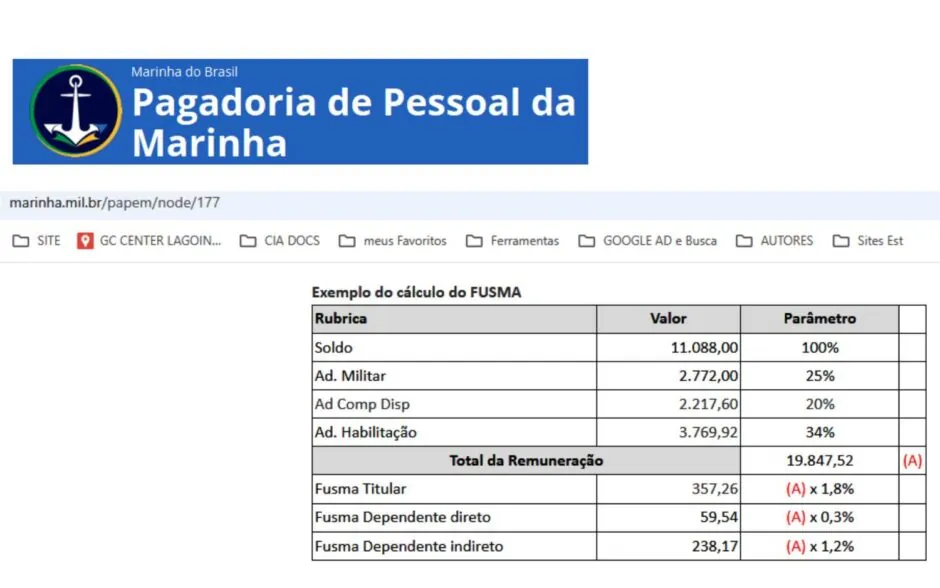 Tabela com Percentuais de desconto para o Fundo de Saúde da Marinha do Brasil – Pagadoria da Marinha