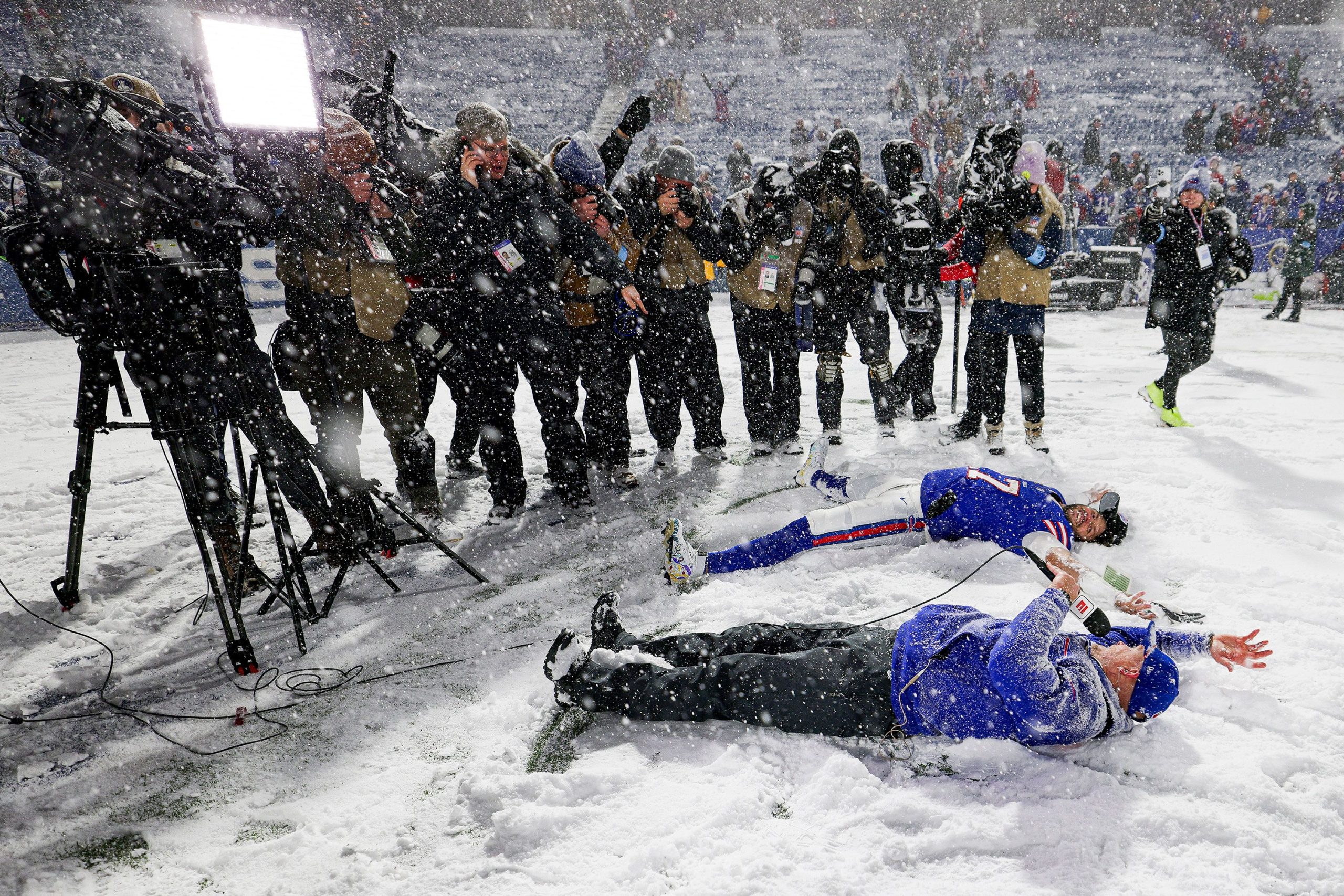 Cerca de 60 centímetros de neve pesada também enterraram Orchard Park, em Nova York, onde o Buffalo Bills garantiu uma vitória por 35 a 10 contra o San Francisco 49ers na noite de domingo. Equipes e voluntários já haviam ajudado na remoção da neve do campo ao ar livre do Highmark Stadium.
