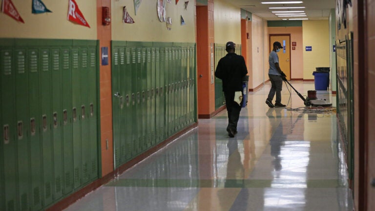 Os zeladores limpam os corredores da escola K-8 da Mildred Avenue, em Mattapan, durante a pandemia de COVID-19 em 2020. David L Ryan/Equipe do Boston Globe, Arquivo