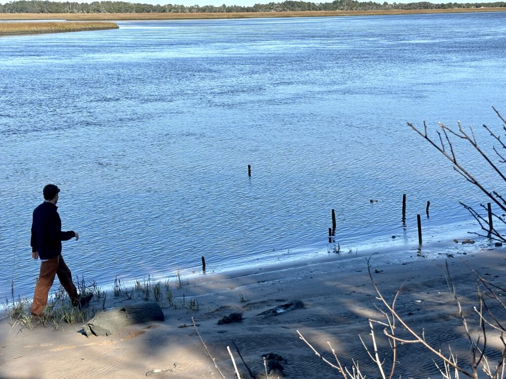 O professor de engenharia costeira da UNF, Raf Crowley, caminha ao longo da margem do rio Fort George, na Reserva Ecológica e Histórica de Timucuan. | Michelle Corum, Jacksonville hoje