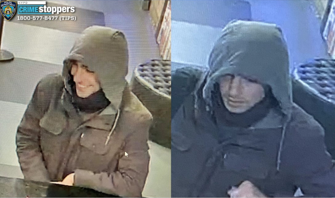 A polícia divulgou diversas imagens do homem vestindo uma jaqueta com capuz e uma máscara que escondia a maior parte do rosto – um visual que não teria chamado a atenção em uma manhã fria.
