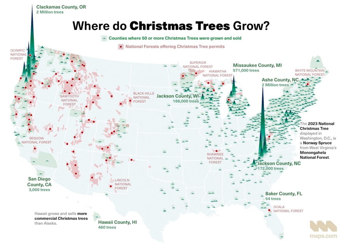 A Carolina do Norte é o segundo maior produtor de árvores de Natal dos EUA. A maioria das árvores de Natal da Flórida vem das Carolinas ou do Centro-Oeste.