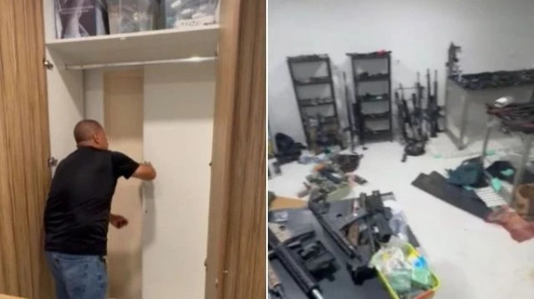 Os agentes realizaram uma busca detalhada no imóvel e localizaram um armário com fundo falso. A passagem escondia um porão repleto de armas de grosso calibre, incluindo fuzis, submetralhadoras, escopetas, revólveres, pistolas e munições.