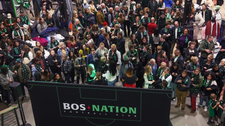 Uma visão dos fãs do BOS Nation no evento de lançamento da equipe Boston NWSL na Dick’s House of Sports na terça-feira. Barry Chin/Equipe da Globo