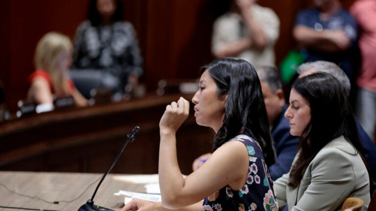 A prefeita de Boston, Michelle Wu, testemunhou durante uma audiência na Câmara Estadual sobre sua proposta tributária em julho. Pat Greenhouse/Boston Globe