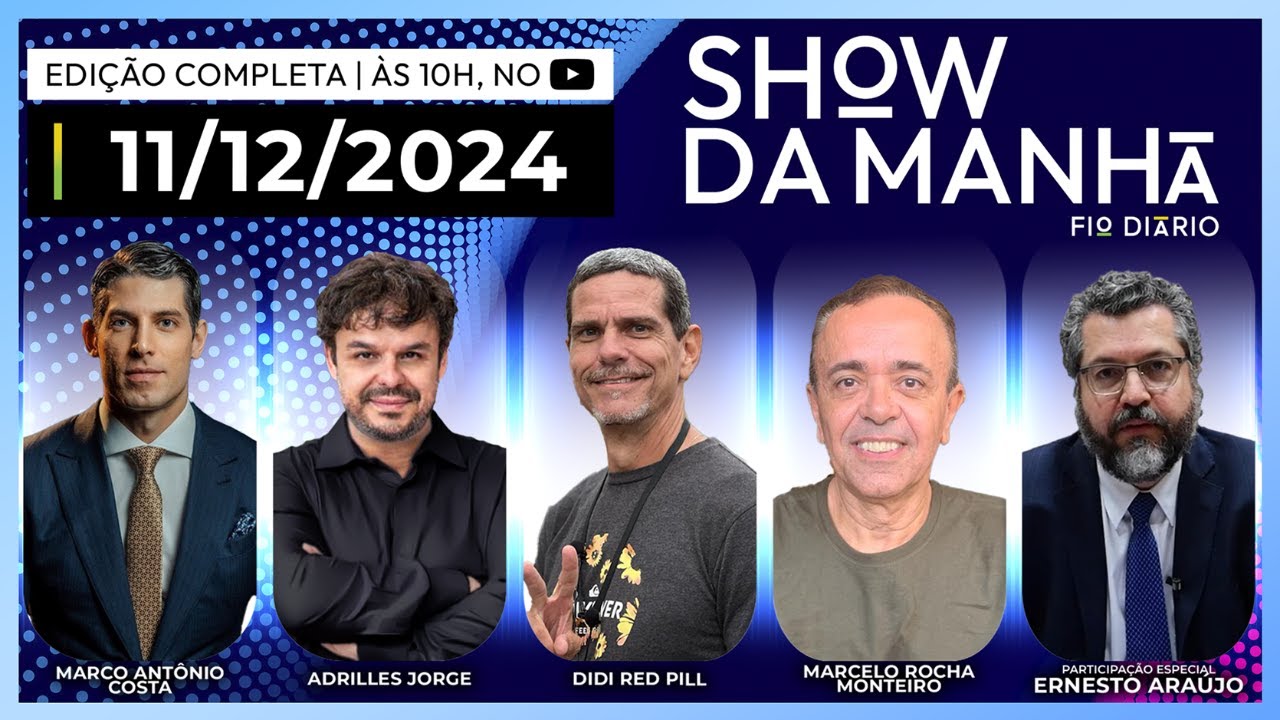 Apresentado por Marco Antônio Costa, com os comentários de Adrilles. Convidados de hoje: Didi Red Pill e Marcelo Rocha Monteiro. Participação especial: Ernesto Araújo. O Show da Manhã vai ao ar de segunda a sexta, das 10h às 12h.