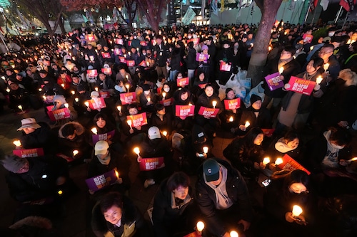 Pessoas seguram velas durante uma vigília à luz de velas contra o presidente sul-coreano Yoon Suk Yeol em Seul, Coreia do Sul, quarta-feira, 4 de dezembro de 2024. (AP Photo/Lee Jin-man)PA