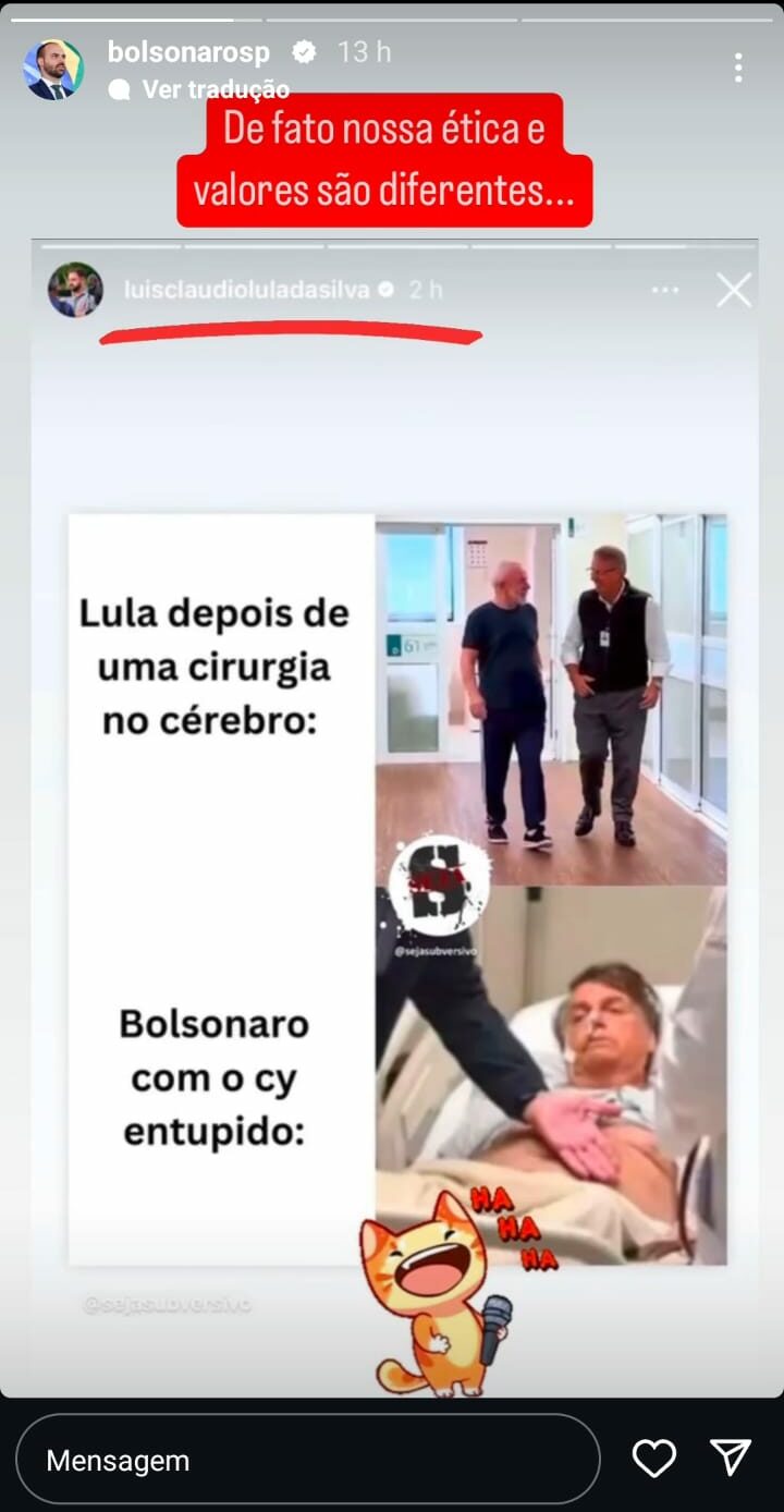 Neste sábado (14), o deputado federal Eduardo Bolsonaro (PL) rebateu ao comentário irônico divulgado pelo filho caçula do presidente Lula (PT), Luís Cláudio Lula da Silva, que comparou a internação de seu pai com a do ex-presidente Jair Bolsonaro (PL).