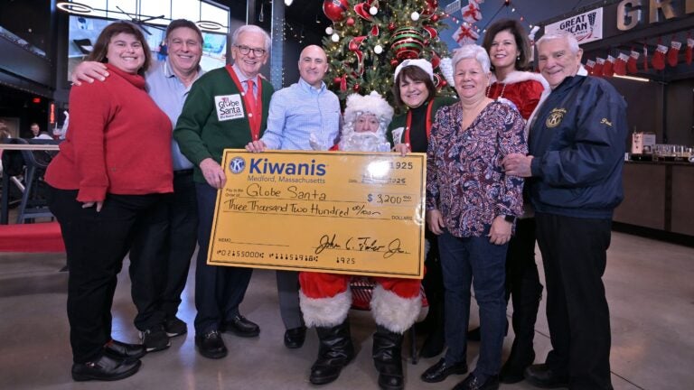 O Medford Kiwanis Club presenteou o Globe Santa com um cheque de US$ 3.200 no Great American Beer Hall. Incluídos na foto estão, na última fila, ao redor do Globe Santa, começando pelo terceiro a partir da esquerda, o diretor executivo do Globe Santa, Bill Connolly, o presidente da Medford Kiwanis, John Falco, a presidente eleita Rita Cornelio, o ex-presidente Kelly Catallo e o deputado estadual de Medford, Paul Donato. Josh Reynolds para o Boston Globe