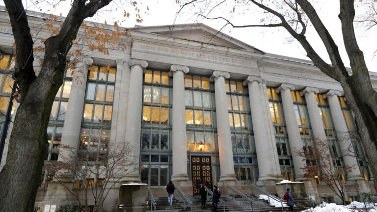 Na foto desta quinta-feira, 5 de dezembro de 2019, transeuntes caminham perto da entrada de um prédio da Harvard Law School, em Cambridge, Massachusetts. AP Foto/Steven Senne