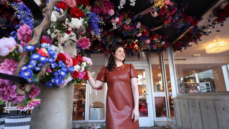 Rachel Kanter está sob as flores de seda na entrada de sua loja, Lovestruck Books. (Suzanne Kreiter/Equipe da Globo)