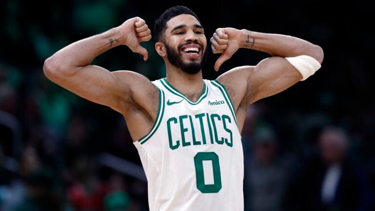 Jayson Tatum estava com espírito positivo antes da derrota do Celtics para o Bulls na quinta-feira. (Danielle Parhizkaran/Equipe do Globo)